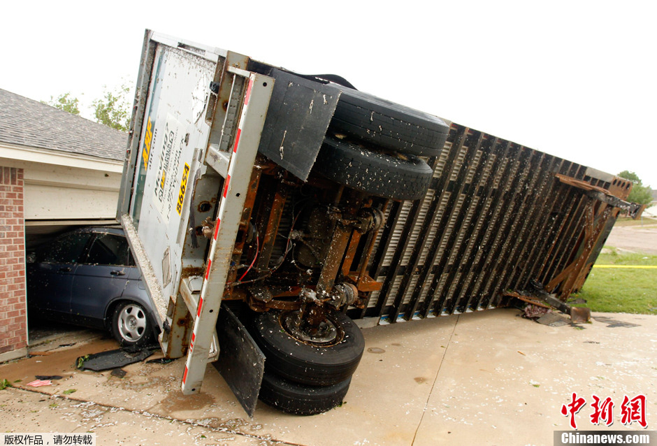 当地时间2013年5月16日,美国得克萨斯州格兰柏立,遭遇强力龙卷风袭击,截至目前已造成6人死亡,超过100人受伤。图为卡车被龙卷风掀翻。