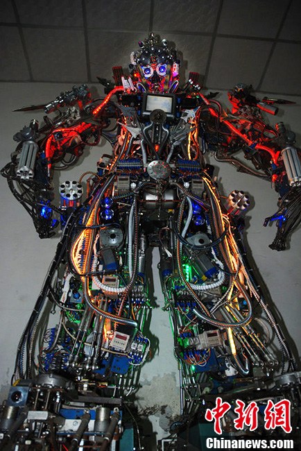 陶相礼启动开关后,机器人身上亮起绚丽的灯光,随后,机器人作出抬腿、挥手扭脖子等各种动作,甚至连它的眼睛都能眨动。当陶相礼在机器人前方作出不同的动作时,机器人也能跟着模仿。图片来源:CFP视觉中国