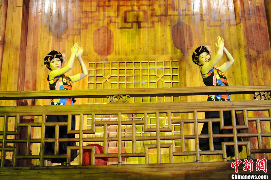 5月17日晚,成百上千的海内外游客涌入张家界魅力湘西大剧院观赏新版的《张家界·魅力湘西》。主办方将一大批民俗文化表演素材和民间艺人请出山寨、请上舞台,使诸多隐匿深山、濒临失传的湘西民俗文化和民间技艺重现。图为阁楼上的少数民族姑娘。杨华峰 摄