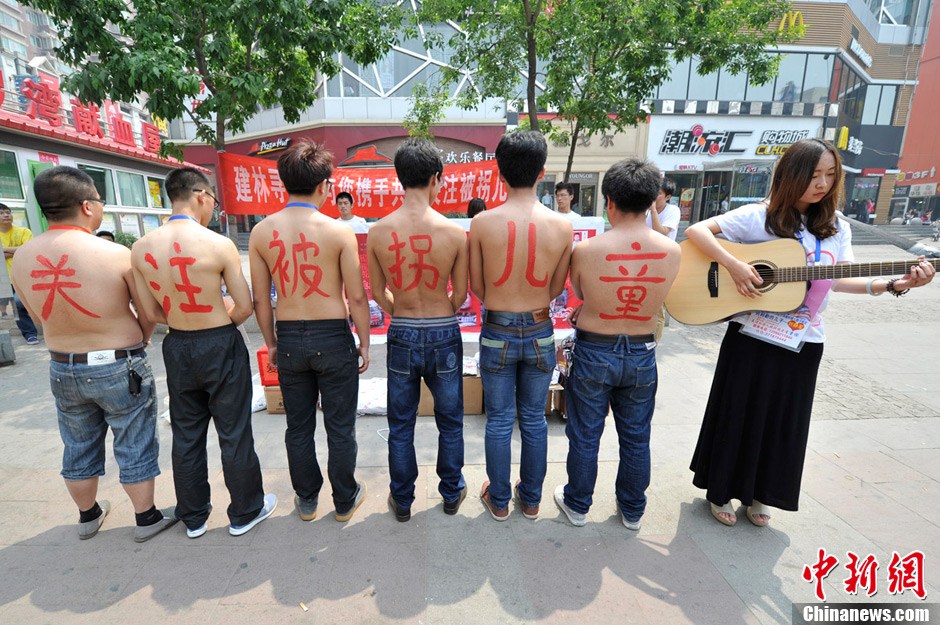 5月18日,在山西太原柳巷商业街,来自太原工业学院的大学生赤膊宣传打拐,希望通过此种方式让社会民众关注被拐儿童,提高防拐打拐意识。 韦亮 摄