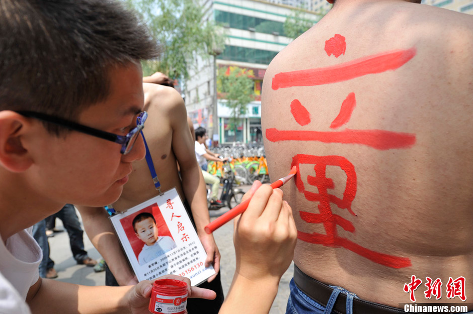 5月18日,在山西太原柳巷商业街,来自太原工业学院的大学生赤膊宣传打拐,希望通过此种方式让社会民众关注被拐儿童,提高防拐打拐意识。 韦亮 摄