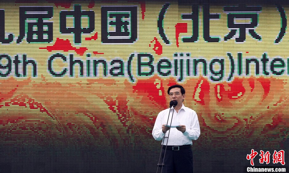 5月18日,北京市市长、第九届园博会组委会主任王安顺在开幕式上致辞。当日上午,第九届中国(北京)国际园林博览会举行开幕式。中新社发 李慧思 摄