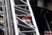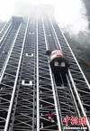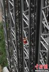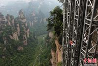 5月18日,法国知名攀爬运动员让·米歇尔·卡萨诺瓦(中文名马今),在张家界武陵源核心景区成功徒手攀爬百龙天梯钢结构井架。百龙天梯是被载入吉尼斯世界纪录的世界最高电梯,垂直高差335米,由山体内坚井和山外钢结构组成。马今挑战的是其山体外贴山全裸钢结构井架,高172米,用时1小时8分完成挑战,攀爬过程中无任何安全保护措施。杨华峰 摄