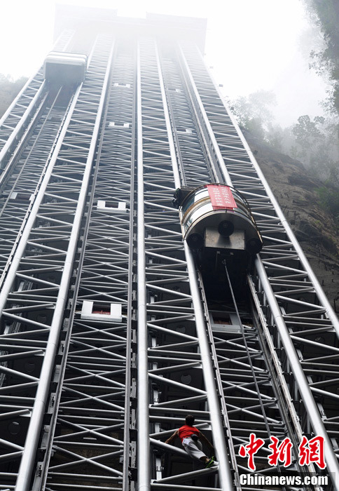 5月18日,法国知名攀爬运动员让·米歇尔·卡萨诺瓦(中文名马今),在张家界武陵源核心景区成功徒手攀爬百龙天梯钢结构井架。图为马今攀爬中。杨华峰 摄