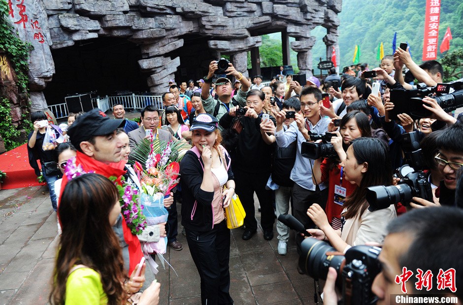 5月18日,法国知名攀爬运动员让·米歇尔·卡萨诺瓦(中文名马今),在张家界武陵源核心景区成功徒手攀爬百龙天梯钢结构井架。图为挑战成功的马今收到了媒体热捧。杨华峰 摄