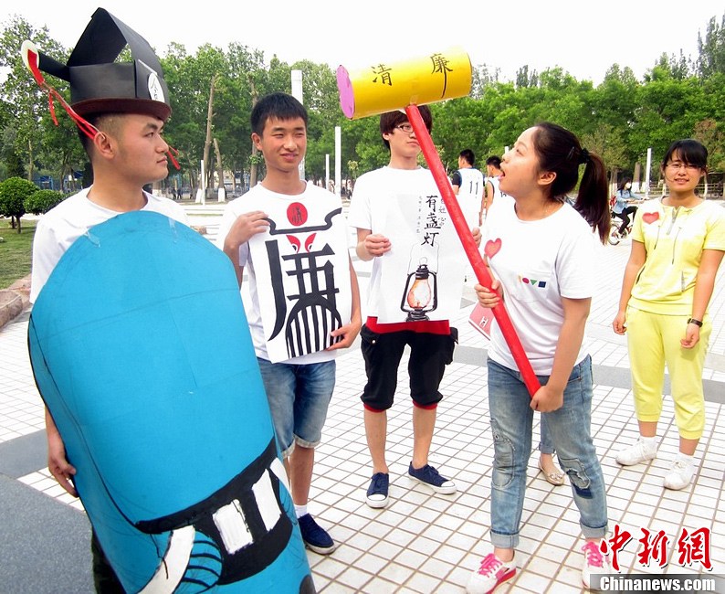 日前,山东聊城大学美术学院大学生志愿者举办了“崇廉尚洁,永驻我心”为主题的廉洁教育公益宣传活动。大学生们用制作的道具,扮演漫画作品中的形象,现场表演打击有悖廉洁建设的不正之风。中新社发 赵玉国 摄 图片来源:CNSPHOTO