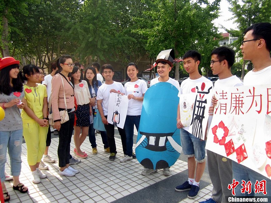 日前,山东聊城大学美术学院大学生志愿者举办了“崇廉尚洁,永驻我心”为主题的廉洁教育公益宣传活动。大学生们用制作的道具,扮演漫画作品中的形象,现场表演打击有悖廉洁建设的不正之风。中新社发 赵玉国 摄 图片来源:CNSPHOTO