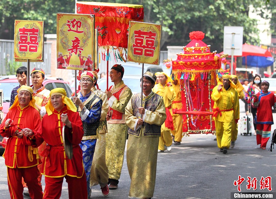 5月19日,一支浩浩荡荡的古装迎亲队伍出现在南京秦虹路街头,新郎新娘一个坐在花轿上,一个走在迎亲队伍中,在敲锣打鼓声中一路行进,吸引了沿途路人的目光,他们纷纷拿起手机,拍下喜庆的时刻。据了解,中式婚礼分为汉制、周制、清制等,这几年,随着年轻人追求婚礼个性、浪漫与环保等,中式婚礼越来越受一些年轻人的喜爱。中新社发 泱波 摄