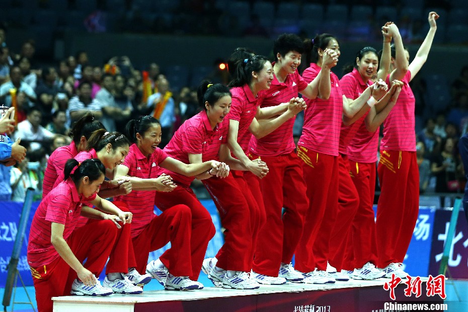 5月19日晚,经过三天激战,2013年中国国际女排精英赛宁波北仑站的争夺全部结束。中国女排在收官战中经过四局激战以3-1力克古巴,全胜战绩摘得郎平带队后的首个冠军,四局比分为25-19、21-25、25-16和25-18。中新社发 富田 摄