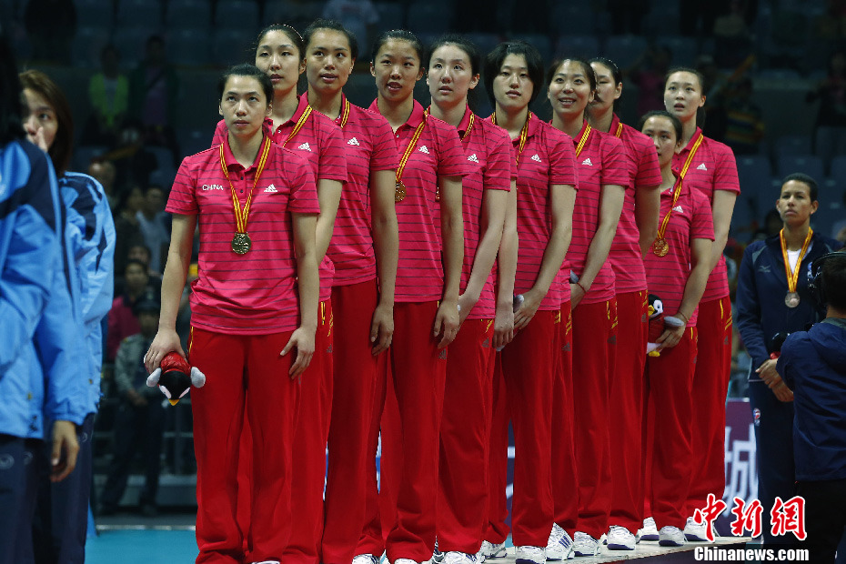 5月19日晚,经过三天激战,2013年中国国际女排精英赛宁波北仑站的争夺全部结束。中国女排在收官战中经过四局激战以3-1力克古巴,全胜战绩摘得郎平带队后的首个冠军,四局比分为25-19、21-25、25-16和25-18。中新社发 富田 摄