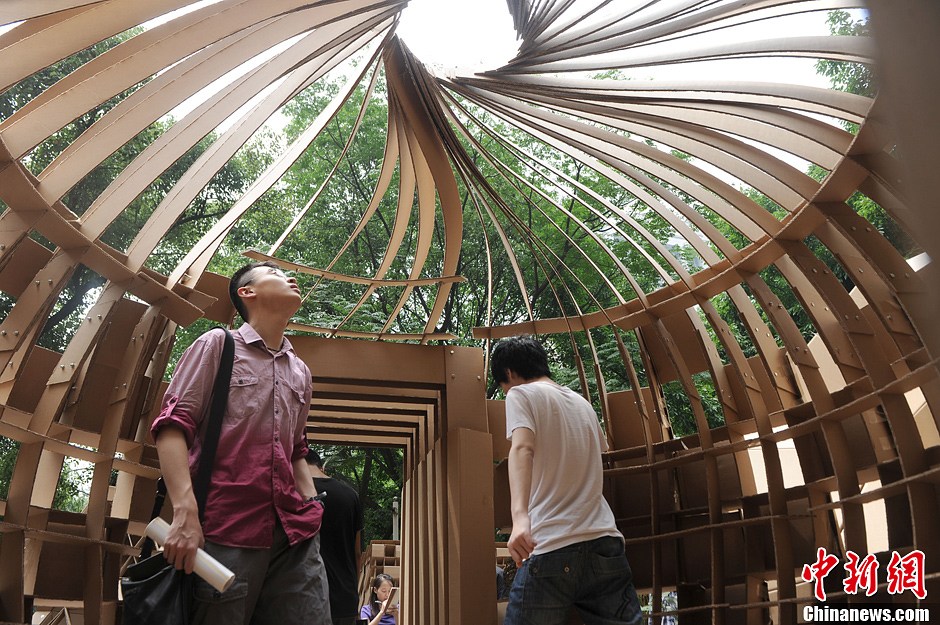 5月20日,重庆大学学生在校园内利用纸板建造起各式各样的“小窝”,阳光透过纸板的空隙照射在室内如同梦幻空间。图为学生正在参观纸屋。陈超 摄