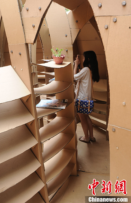5月20日,重庆大学学生在校园内利用纸板建造起各式各样的“小窝”,阳光透过纸板的空隙照射在室内如同梦幻空间。图为学生正在参观纸屋。陈超 摄