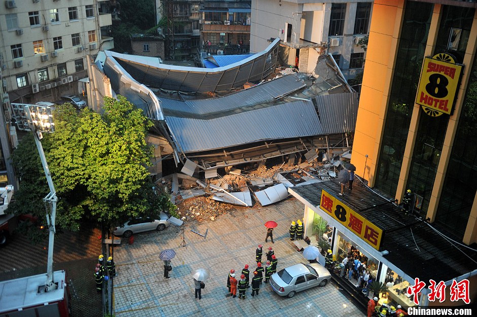 5月20日下午,福州繁华路段五一中路,一正在装修的速8酒店附属楼发生坍塌事故,据现场目击者说坍塌时楼里可能有10多人,截至记者发稿时,消防正在紧急救援,伤亡暂不明。中新社发 王东明 摄