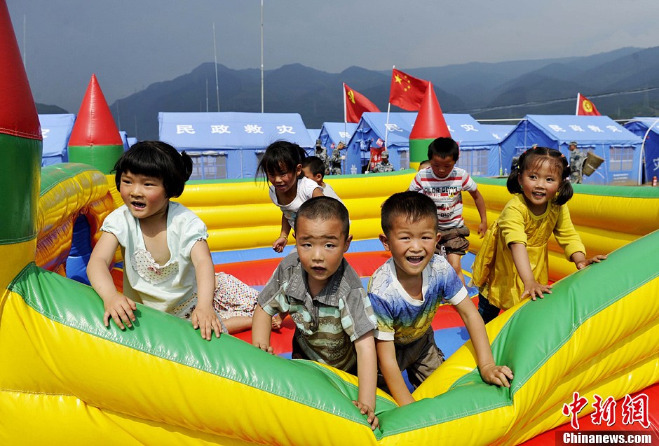 5月20日,成都军区空军建设的“群众文化广场、便民服务棚区”在震中芦山龙门乡最大的集中安置点投入使用,至此,十里八乡的受灾群众有了一个文化娱乐的去处。图为便民服务棚区里的儿童乐园。中新社发 安源组稿