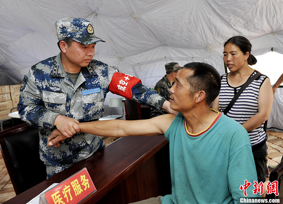 5月20日,成都军区空军建设的“群众文化广场、便民服务棚区”在震中芦山龙门乡最大的集中安置点投入使用,至此,十里八乡的受灾群众有了一个文化娱乐的去处。图为便民服务棚区里的医疗点。中新社发 安源组稿