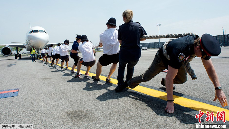 当地时间2013年5月20日,美国纽约,第4届“拉飞机”大赛在肯尼迪国际机场举行。伦敦警察、纽约警察以及机场工作人员组队参加比赛,比试谁能在最短时间内把空客A320喷气式飞机拉到100英尺的距离外。