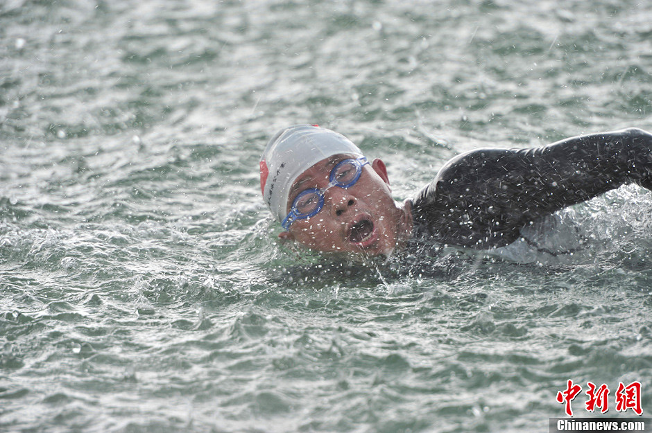 5月20日凌晨5时,来自全国各地的12位游泳爱好者挑战琼州海峡,来自湖北省京山县杨猛进经过11小时艰苦游行,第一个抵达终点海口白沙门沙滩。截止19时,来自重庆的张颖,江苏南通的李谦,来自上海的陈方方、柯毓娴等11人已先后挑战成功横渡,今年66岁的游章云因身体原因和海面风高浪急,还下起大雨,未能成功横渡。图为来自湖北省京山县杨猛进在暴雨中奋力前行。中新社发 骆云飞 摄