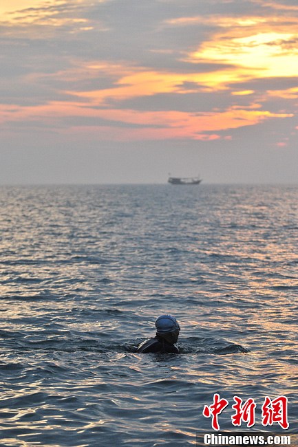 5月20日凌晨5时,来自全国各地的12位游泳爱好者挑战琼州海峡,来自湖北省京山县杨猛进经过11小时艰苦游行,第一个抵达终点海口白沙门沙滩。截止19时,来自重庆的张颖,江苏南通的李谦,来自上海的陈方方、柯毓娴等11人已先后挑战成功横渡,今年66岁的游章云因身体原因和海面风高浪急,还下起大雨,未能成功横渡。图为66岁的游章云正在朝霞下游行。中新社发 骆云飞 摄