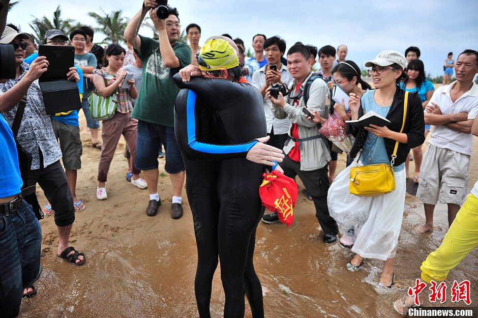 5月20日凌晨5时,来自全国各地的12位游泳爱好者挑战琼州海峡,来自湖北省京山县杨猛进经过11小时艰苦游行,第一个抵达终点海口白沙门沙滩。截止19时,来自重庆的张颖,江苏南通的李谦,来自上海的陈方方、柯毓娴等11人已先后挑战成功横渡,今年66岁的游章云因身体原因和海面风高浪急,还下起大雨,未能成功横渡。图为来自上海的陈方方、柯毓娴夫妇成功横渡后相拥。中新社发 骆云飞 摄