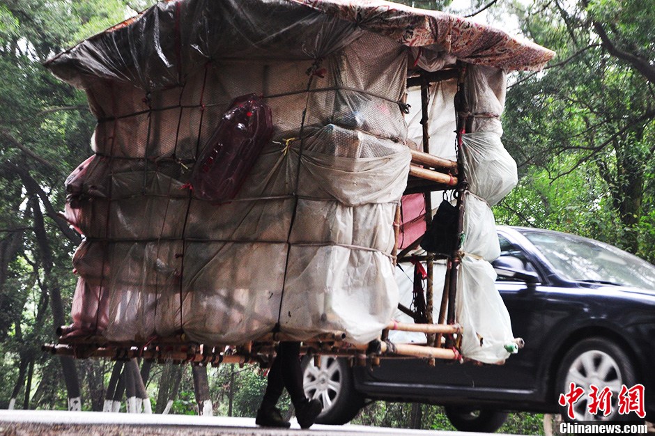 5月21日,广西柳州市融安县男子刘龄潮肩挑一栋“房子”行走在209国道柳州市路段。刘龄潮今年38岁,5年前,其用几根竹杆、塑料和床单扎成一个简易房子,从深圳出发,用肩挑着游走四方。该简易屋子重约120斤,可随时随地遮风挡雨及扎营。几个月前,刘龄潮从广西梧州出发,经过藤县、玉林等地,到达柳州,一路上靠捡拾塑料瓶等废旧物品贩卖为生。该简易屋子已是其制作的第三个“房子”。中新社发 木子 摄