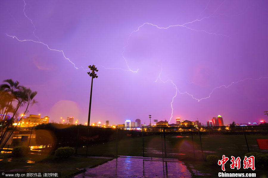 2013年05月25日傍晚,海口下起暴雨,并伴有闪电,闪电持续了一个多小时。图片来源:CFP视觉中国