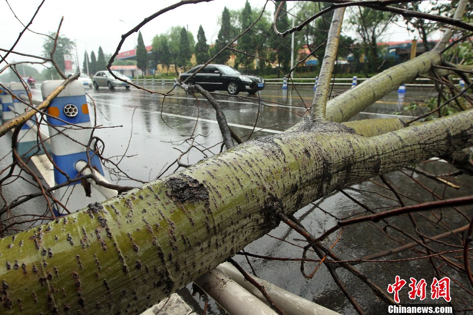 5月26日,由于强降雨对根基的冲刷,河南许昌八一西路一棵大树倾倒后砸在交通护栏上。当日,河南许昌遭遇强降雨天气,城区多个地段出现积水内涝。中新社发 牛书培 摄 图片来源:CNSPHOTO