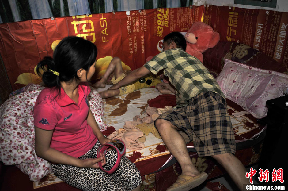 每天早晨,斐斐的父母都要帮助她穿戴用于植皮恢复的面具和衣服,紧绷的衣服穿在身上很不好受。斐斐很抗拒穿着这身“装备”,经常躲到墙角。胡影 摄