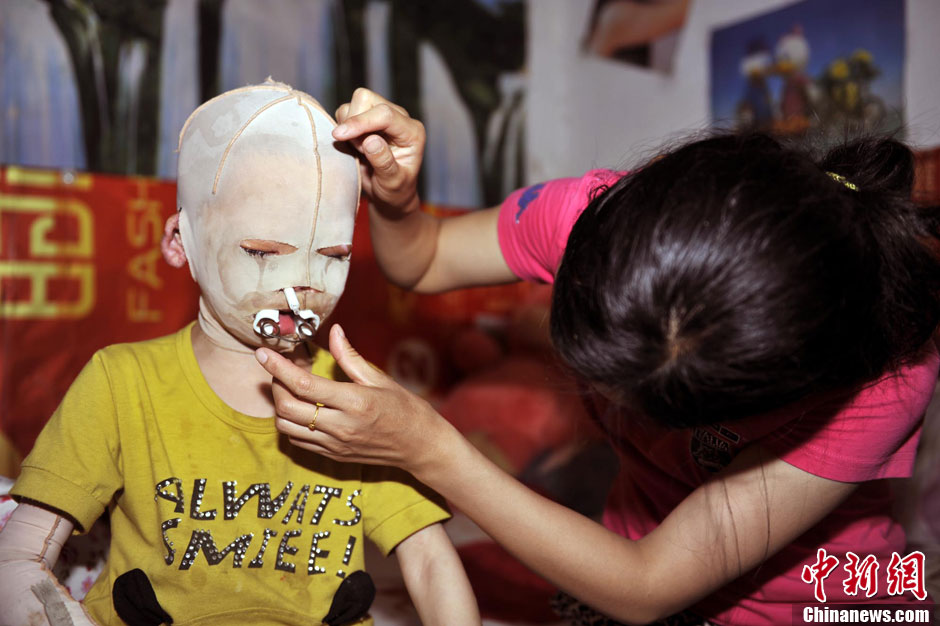 支撑嘴巴的康复器械、用于呼吸的呼吸管……这些东西带给斐斐常人无法想象的痛苦,她也常常疼得直流眼泪。胡影 摄