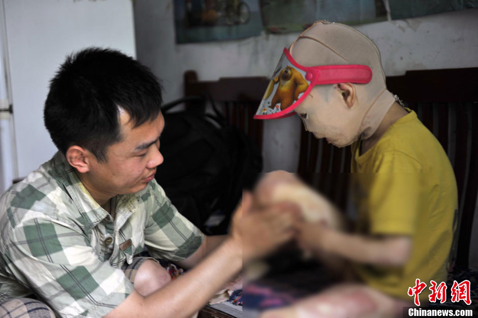 一场灾难让斐斐的全身皮肤遭到伤害,没有了毛孔,就不能像正常人一样排汗。天热的时候,身上痒的难受,又不能用手去抓,斐斐的父母只好轻轻的拍打来帮助斐斐减轻痛苦。胡影 摄