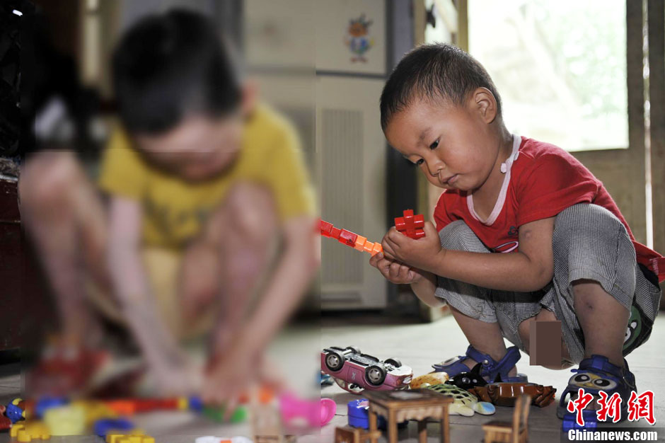 为了给斐斐找个小同伴,斐斐的父母给她买了许多玩具,他们让邻居家的小朋友们过来一起玩,时间长了,小朋友们开始慢慢习惯斐斐的面具,慢慢接受她。胡影 摄