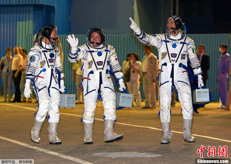 当地时间2013年5月29日,哈萨克斯坦拜科努尔发射场,三名宇航员搭乘联盟TMA-09M号宇宙飞船前往国际空间站,他们将在国际空间站逗留172天,完成34项实验。图为(从左至右)美国宇航员伦·尼伯格、俄罗斯宇航员尤尔奇欣和意大利宇航员卢卡。