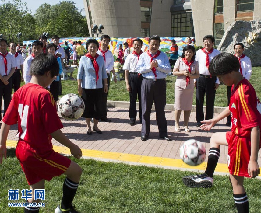 5月29日,中共中央总书记、国家主席、中央军委主席习近平在北京市少年宫参加“快乐童年放飞希望”主题队日活动。这是习近平在观看孩子们练习足球。新华社记者 李学仁 摄 图片来源:新华网