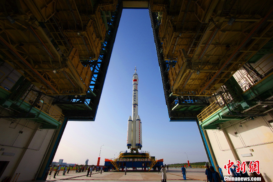 中国载人航天工程新闻发言人6月3日对外宣布,中国将于6月中旬择机发射神舟十号飞船,3名航天员将再次访问天宫一号。当天上午,承载着组合体的活动发射平台缓缓驶出载人航天发射场垂直总装测试厂房,安全转运至发射塔架。今后几天,发射场将陆续进行飞船、火箭功能检查和船箭地联合测试等工作,进行最终状态检查和确认后,火箭加注推进剂,中旬择机实施发射。图为神舟十号飞船、长征二F遥十火箭组合体,已从酒泉卫星发射中心载人航天发射场技术区垂直转运至发射区。中新社发 黄增光 摄 图片来源:CNSPHOTO