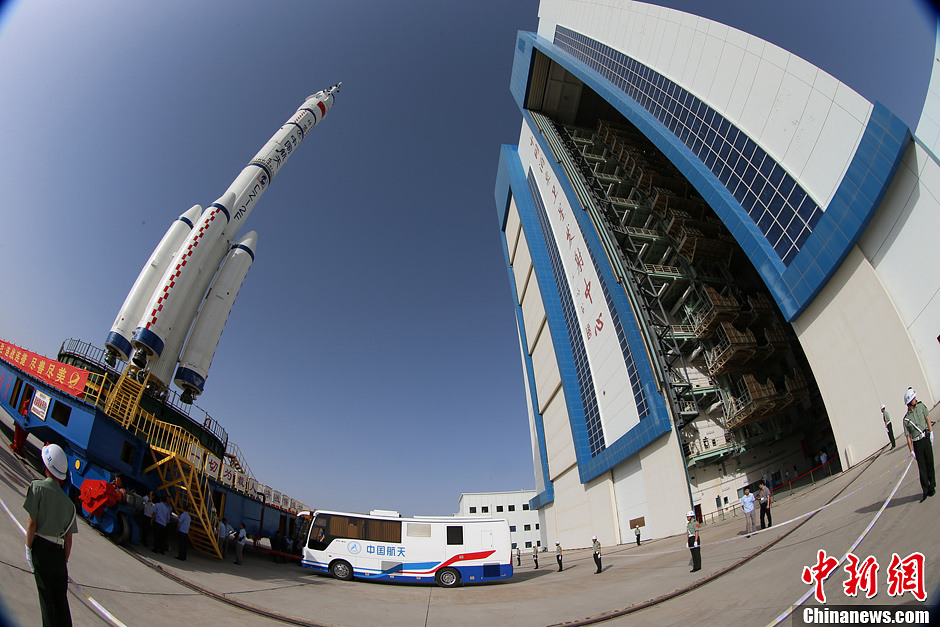 6月3日,中国载人航天工程新闻发言人宣布,中国将于6月中旬择机发射神舟十号飞船。当日,神舟十号飞船、长征二F遥十火箭组合体,从酒泉卫星发射中心载人航天发射场技术区垂直转运至发射区。图为8点36分,神舟十号船箭组合体从垂直组装厂房运出。中新社发 秦宪安 摄