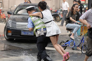 交警背“美眉”趟积水