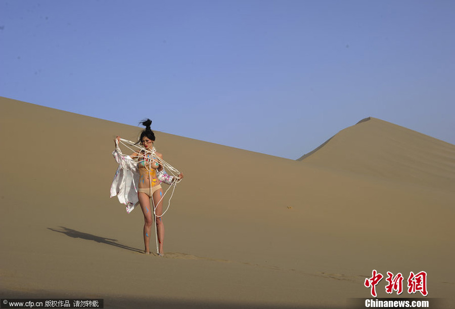 2013年6月4日,甘肃省酒泉市,IBC公益志愿者在敦煌雅丹地貌拍摄“沙裸艺术”。意在以敦煌莫高窟为起点,呼吁全社会关注文化生态保护问题,重新审视人与自然和谐共生的深远意义。朱熙勇 摄 图片来源:CFP视觉中国