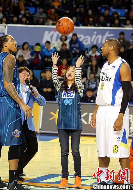 当地时间2012年12月25日,孙妍在现身韩国篮球职业联赛赛场,与球队合影,期间还大秀篮球球技。图片来源:东方IC 版权作品 请勿转载