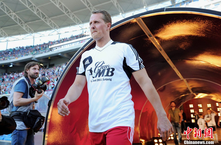 北京时间2013年6月6日2时05分,主题为“再见,队长”的巴拉克告别赛在莱比锡举行,对阵双方是巴拉克朋友队和世界明星队,巴拉克先后代表两队出场,上演帽子戏法。德罗巴梅开二度,诺伊恩多夫和许尔勒各进一球,世界明星队4比3胜出。图为舒马赫作为队员上场比赛。图片来源:Osports全体育图片社