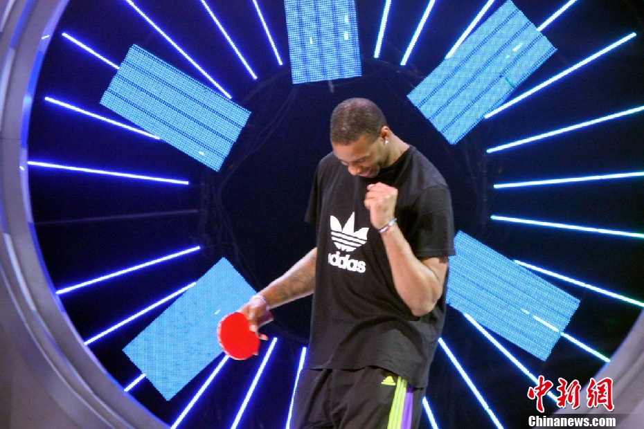 2013年1月30日,麦蒂参与某卫视综艺节目录制,现场与小朋友打乒乓球、网球并展示转球。图片来源:Osports全体育图片社