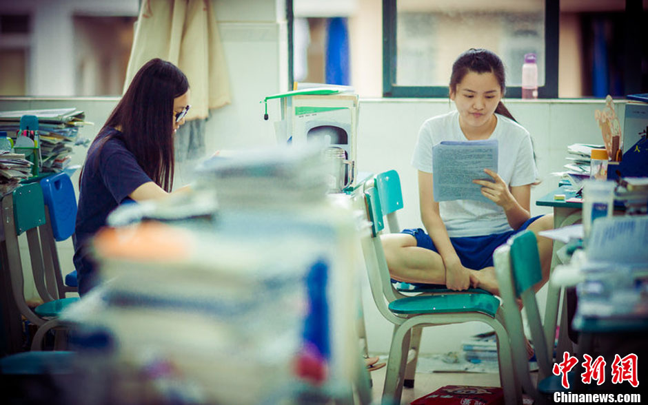 6月3日,广东省惠州市,华罗庚中学26班的女生,放学后仍在教室里复习。周楠 摄 图片来源:CFP视觉中国