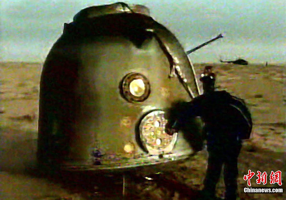 2002年4月1日16时51分,“神舟3号”飞船准确降落在内蒙古中部地区,中国载人航天第三次飞行试验获得圆满成功。中新社发 图片来源:CNSPHOTO