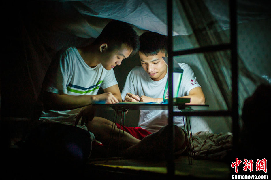 6月3日晚23点28分,广东省惠州市,宿舍楼早已熄灯,华罗庚中学高三(2)班的文健斌(图右)拿出“床上小桌”和台灯,抓起习题集,继续埋头苦干,还时不时地和隔壁床的同学小声讨论。据该宿舍的其他同学介绍,文健斌是他们中的“学习王”,看他“挑灯夜战”早就习以为常了。周楠 摄 图片来源:CFP视觉中国