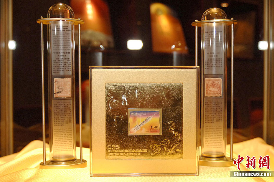 2006年4月13日,中国航天、文物、集邮三大领域合作推出用“神舟六号”搭载的文物邮票为核心创作的当代文物级纪年典藏品——“太和之宝·飞天宝玺”公开发行,全球限量发行九百九十九套。宝玺形制参照清代开国宝玺 “天子之宝”创意造型,采用新疆碧玉,以纯金纯银铸交龙纽,配合“神舟六号”所搭载的飞天珍邮,表达和平利用太空的当代主题。图为“飞天珍邮”或以水晶护屏秘藏,或以航天试管封装。中新社发 徐曦弋 摄
