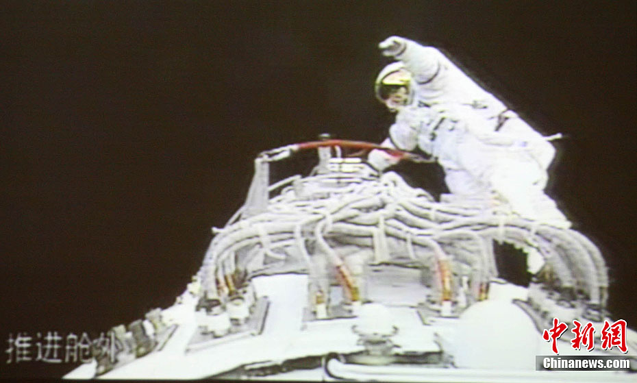北京时间2008年9月27日16:59,“神舟七号”航天员翟志刚成功出舱,实现中国历史上第一次太空行走。图为摄于北京航天飞控中心大屏幕的在太空中的翟志刚。(摄于电视屏幕)中新社发 齐彬 摄