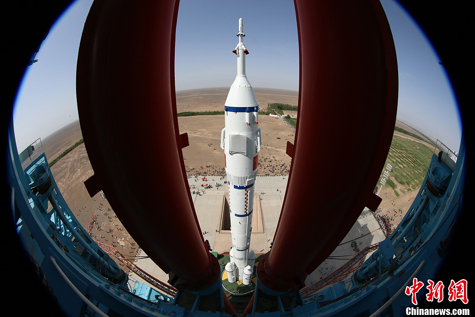 6月3日,中国载人航天工程新闻发言人宣布,中国将于6月中旬择机发射神舟十号飞船。当日,神舟十号飞船、长征二F遥十火箭组合体,从酒泉卫星发射中心载人航天发射场技术区垂直转运至发射区。图为神舟十号船箭组合体以每分钟15至20米的速度,经过一小时,安全到达发射区。中新社发 秦宪安 摄