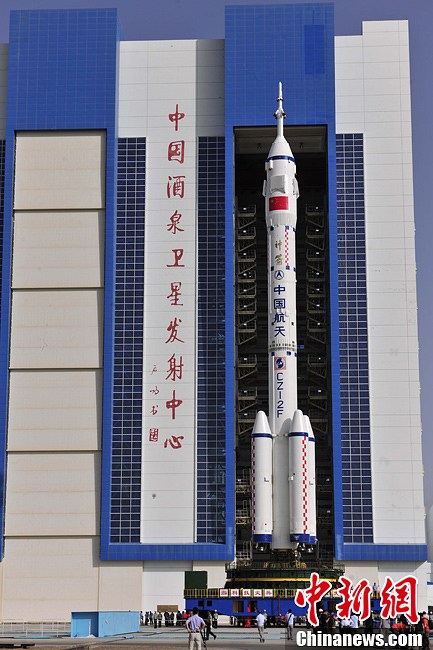 6月3日,中国载人航天工程新闻发言人宣布,中国将于6月中旬择机发射神舟十号飞船。当日,神舟十号飞船、长征二F遥十火箭组合体,从酒泉卫星发射中心载人航天发射场技术区垂直转运至发射区。图为船箭塔组合体矗立在活动发射平台上,等待转往发射区。中新社发 梁杰 摄