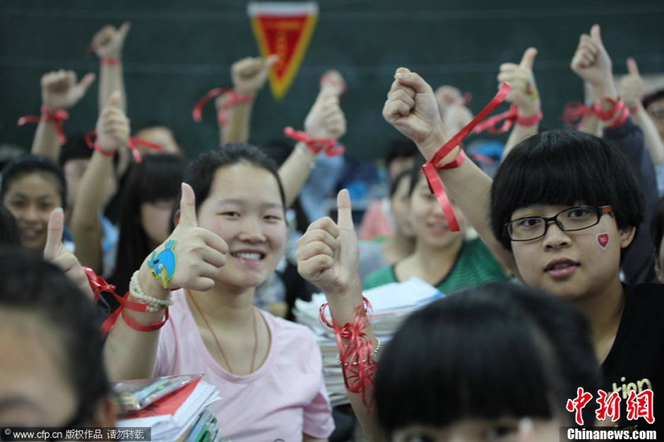 6月7日早晨,桐庐分水高级中学的高三(10)班全体同学伸出绷有红色丝绸带的双手,祝福考出好成绩。何小华 摄 图片来源:CFP视觉中国