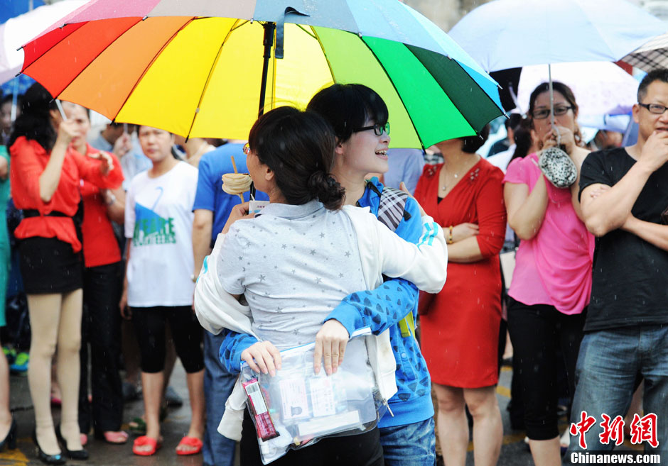 6月7日上午,2013年全国高考大幕正式拉开。在湖南师大附中考点前一位家长与考生拥抱。中新社发 杨华峰 摄