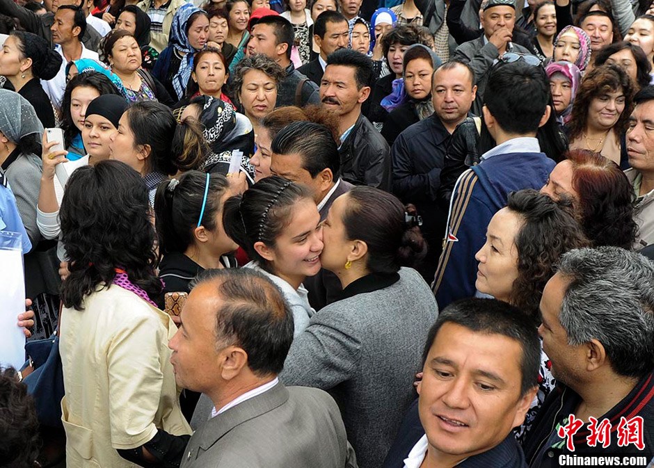 6月7日,2013年全国统一高考拉开序幕,在新疆乌鲁木齐一民族考生考点,大批家长守候在考点门外。第一门语文考试结束后,大批考生走出考场,人群中一位母亲亲吻走出考场的女儿,表示祝贺。刘新 摄