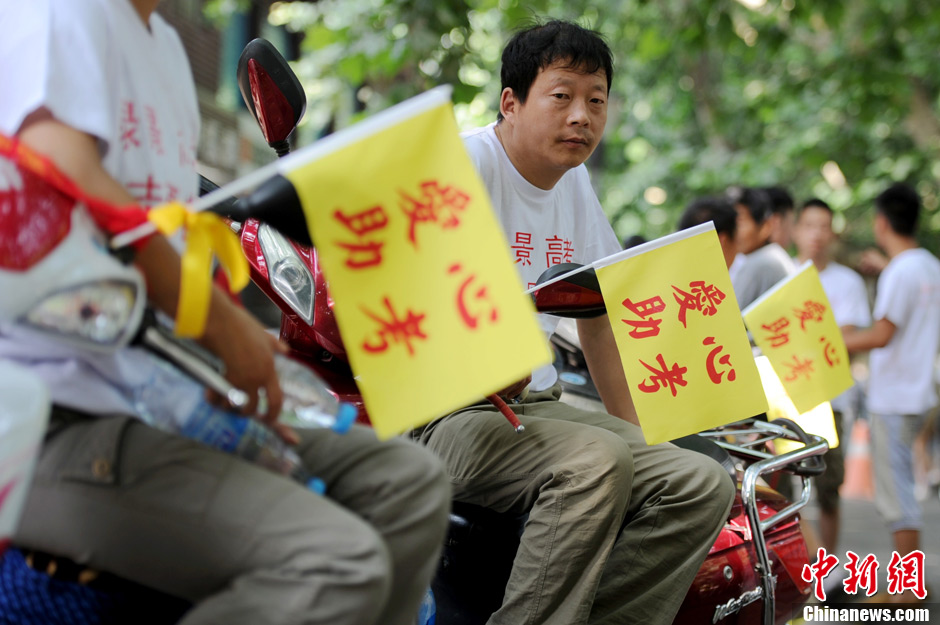 6月7日,2013年全国统一高考拉开序幕。在西安市一考点外,高校招生、补习班、餐饮、商业公司等各类商家纷纷前来“助阵”,不断地向家长们发放印有广告的扇子、矿泉水以及宣传册,上演了一出“广告大战”。图为某餐饮公司前来“助阵”。张远 摄